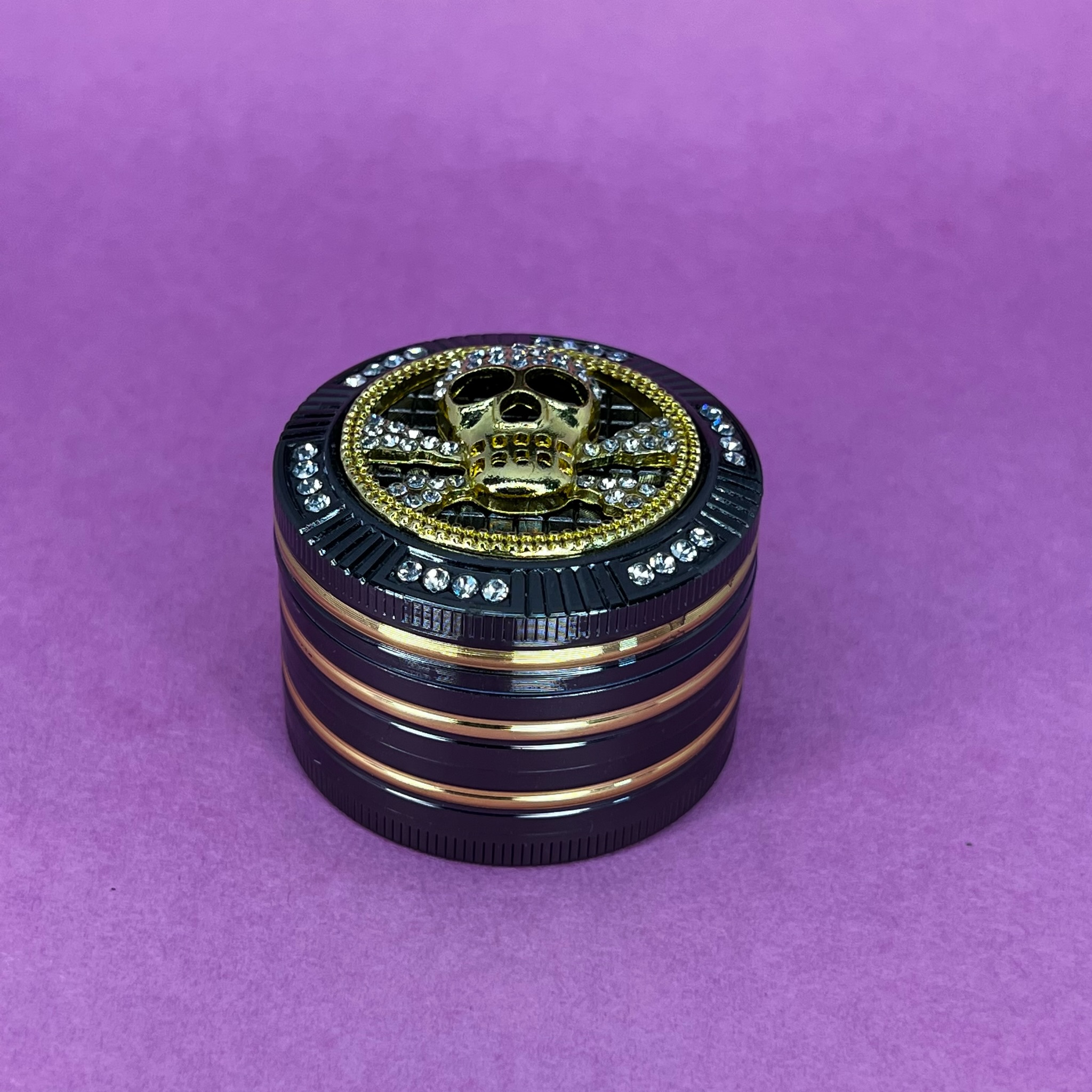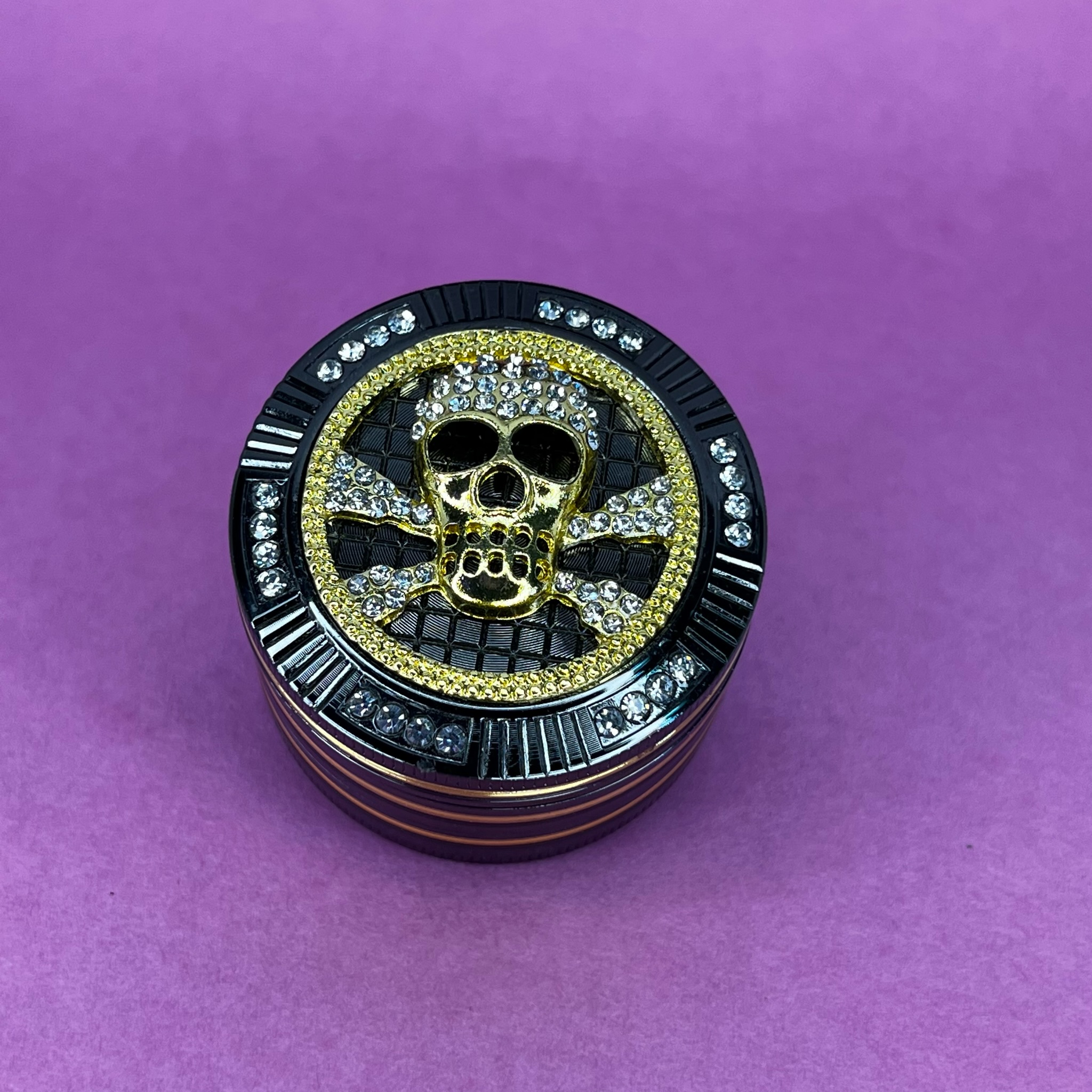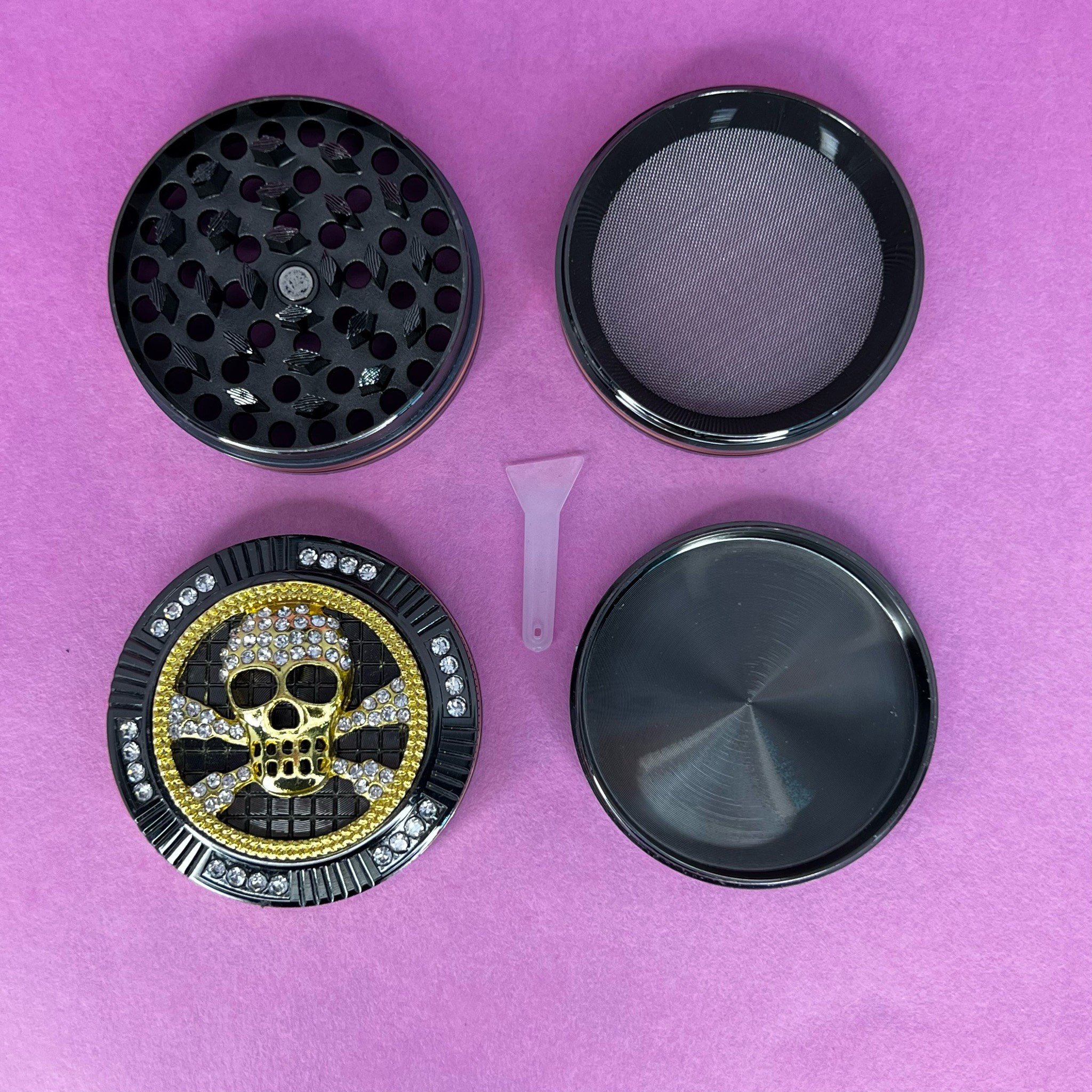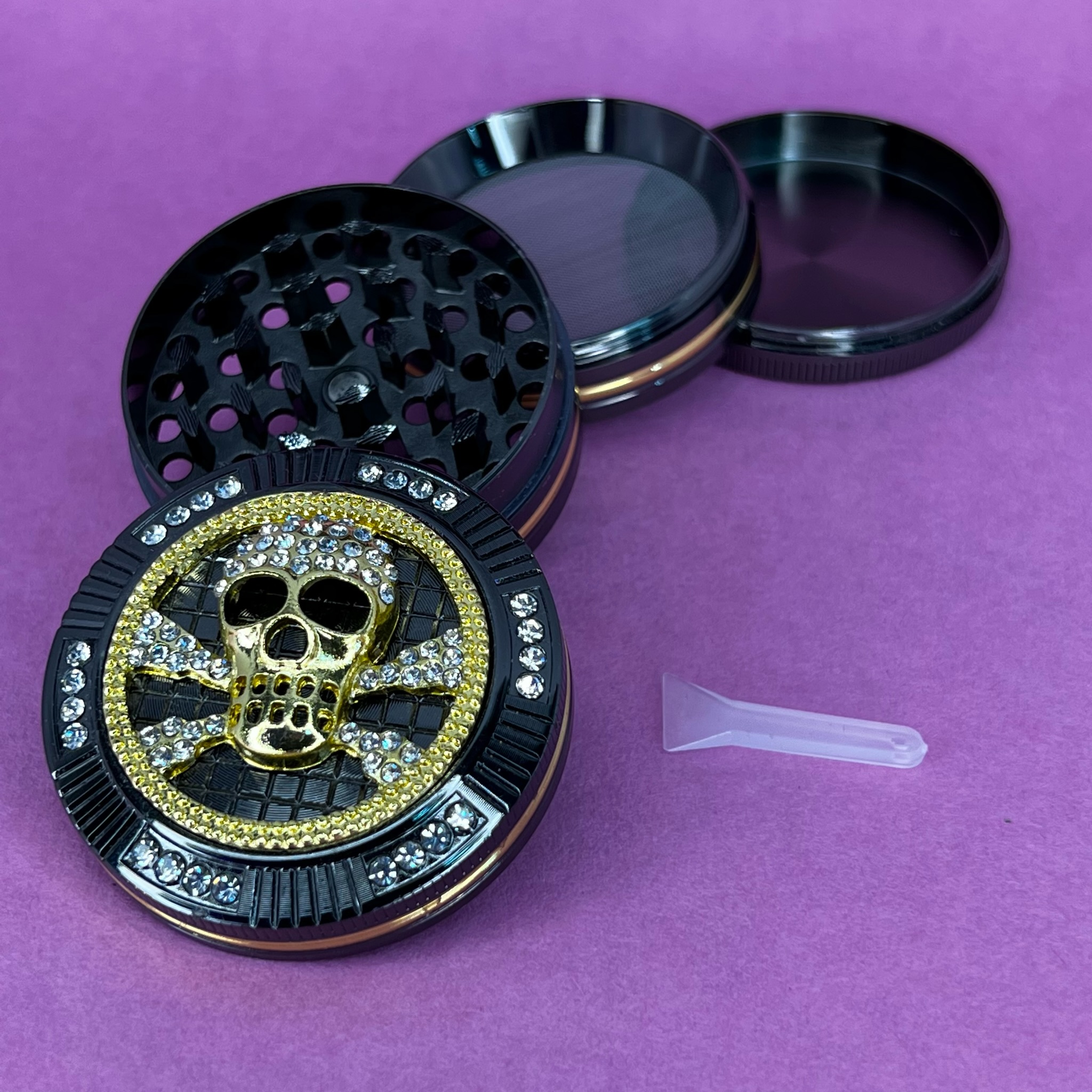 De 4 pisos, mide aprox. 5cm de diámetro y 3,5cm de alto. Tiene palita para juntar hash.